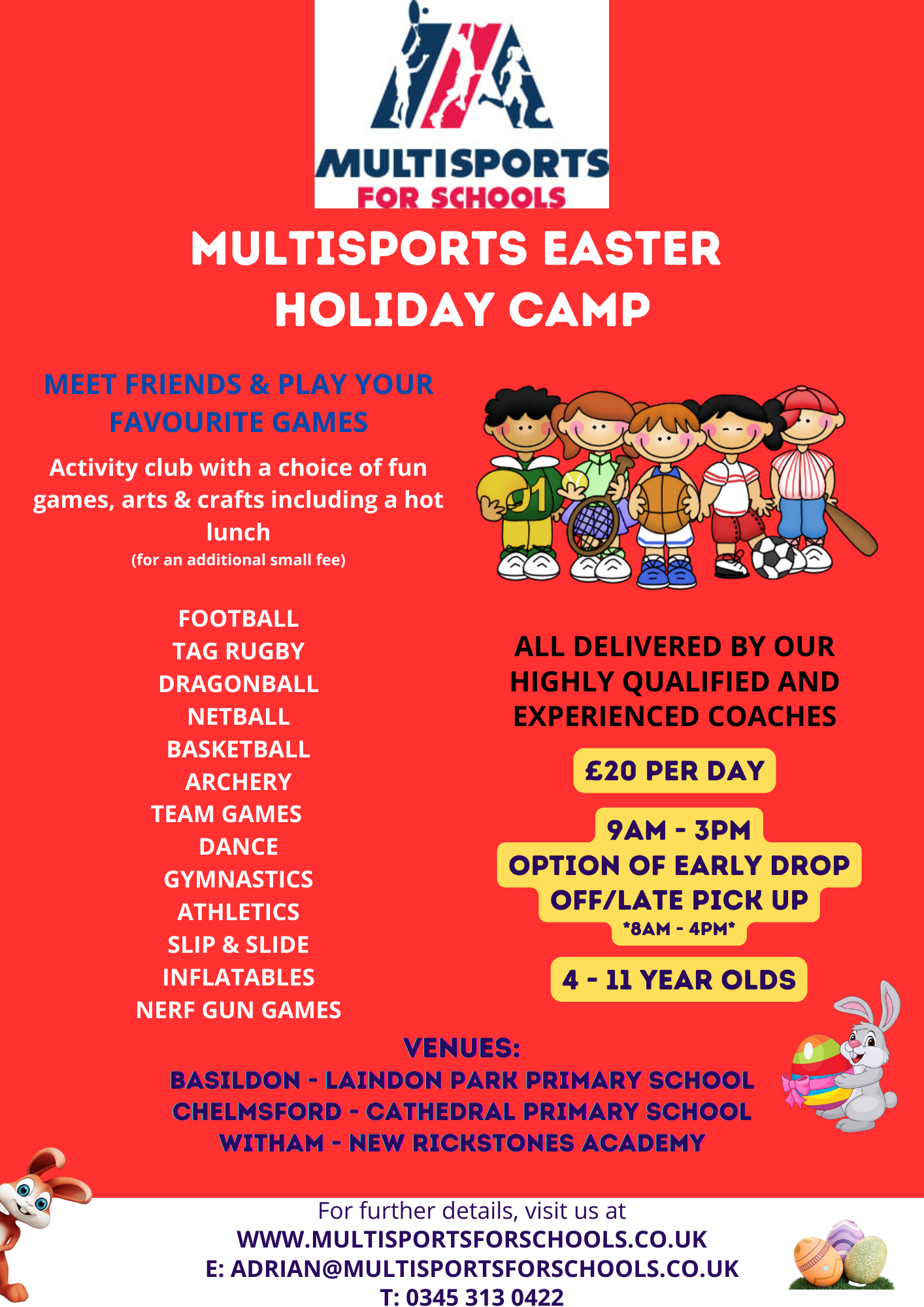 Multisports for Schools are providing 4-11 year olds with fun activities during the Easter holiday camp. Clubs feature fun physical & enrichment activities.